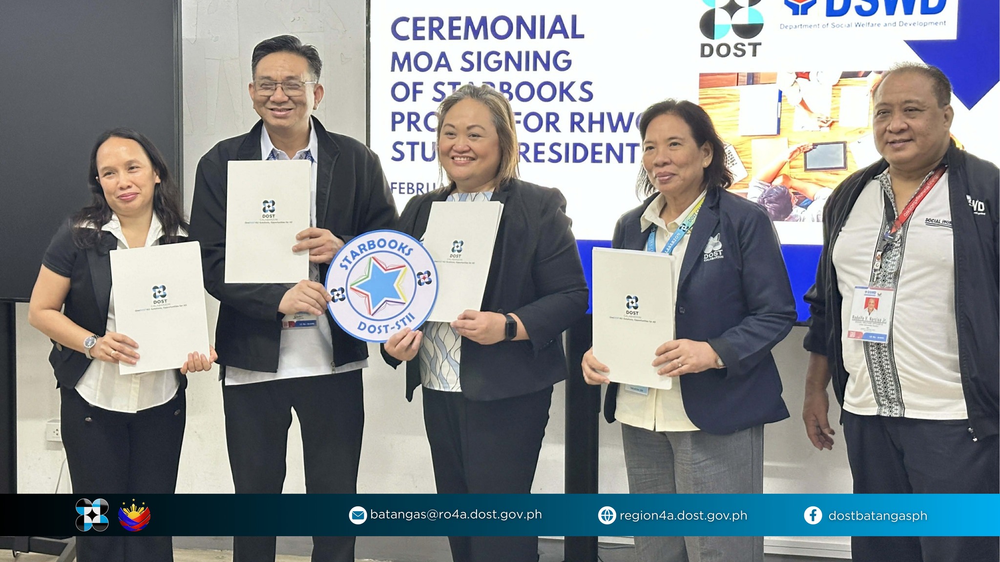The Department of Science and Technology (DOST) IV-A and the Department of Social Welfare and Development (DSWD) IV-A formalized their partnership for the deployment of the Science and Technology Academic and Research-Based Openly Operated KioskS (STARBOOKS) digital library at the Regional Haven for Women and Girls in Rosario, Batangas through a Memorandum of Agreement (MoA) signing held at South Park Center, Alabang, Muntinlupa City, February 16.